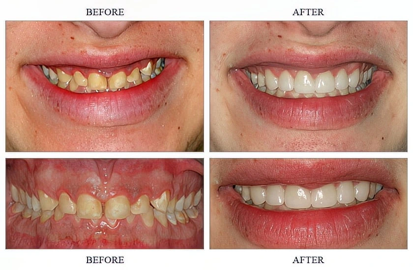 This delightful young lady showed up at my office with chronic gum issues, many cavities (some quite large) around her back and front teeth, stained and discolored teeth with large gaps, and was understandably unhappy with her smile. She said she wanted Porcelain Veneers, but before we could start we had to first take care of the cavities and inflamed gums. Her already small teeth were also partially covered by her gums we first got some help from a great Periodontist (gum specialist) who did some minor gum surgery on her upper front teeth. The next step was to whiten all of her teeth using ZOOM and home tray bleaching. She would have loved to be able to restore most of her teeth, but she was limited by her budget to restoring only her 6 upper front teeth. We used 6 EMAX Ceramic Crowns to close the spaces and create a beautiful result! She loves her smile and told me that a friend of hers recently had veneers placed that were bulky and square and ugly. My patient said she could really tell the difference between our work and her friend’s and even her friend said that she preferred my patient’s veneers. This degree of cosmetics doesn’t happen by accident!